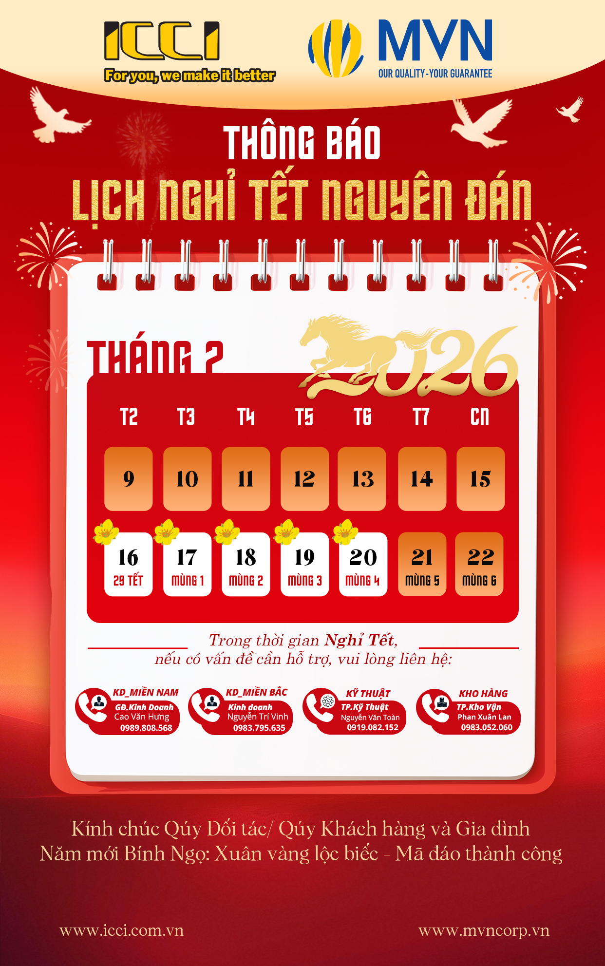 ICC INTERNATIONAL CO.,LTD & MVN INDUSTRY CORPORATION would like to respectfully announce the 2026 Lunar New Year holiday schedule as follows: